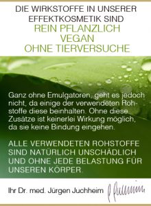 Dr. Jürgen Juchheim versteht seine Arbeit ganzheitlich: Die Wirkstoffe der Effektkosmetik, die seinen Namen tragen, müssen ähnlich wie Instrumente in einem Orchester aufeinander abgestimmt werden, um optimal zu wirken. Bereits geringfügige Änderungen der Konzentrationen können zu unterschiedlichen Wirkungen führen. Wer die Wirkung mit eigenen Augen sieht, glaubt tatsächlich sofort, dass hier die Grenze von der Wissenschaft zur Kunst überschritten wird.